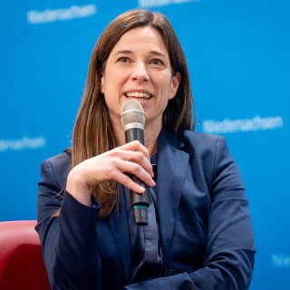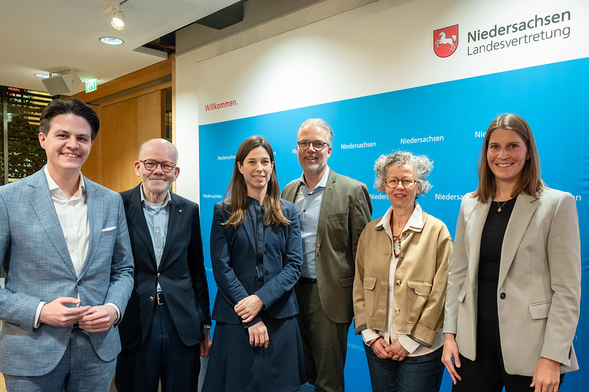 Am 25. März 2025 wurde in der Niedersächsischen Landesvertretung in Berlin die Wanderausstellung zum Staatspreis für Architektur 2024 feierlich eröffnet. Im Mittelpunkt des Abends stand ein Podiumsgespräch zum Thema des aktuellen Staatspreises „Nachhaltiges Bauen für Wirtschaft und Arbeit“. Nach der Begrüßung durch Tobias Rohrberg von der Landesvertretung gab Christoph Schild, Vizepräsident der Architektenkammer Niedersachsen und Mitglied der Staatspreisjury, einen Einblick in die Juryarbeit und die Auswahl der ausgezeichneten Projekte.